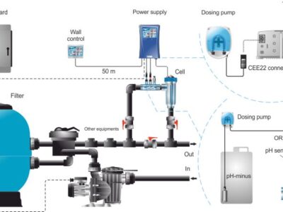• Electrolysis Process: The salt water passes through an electrolytic cell, where an electrical current converts the salt (sodium chloride) into chlorine.