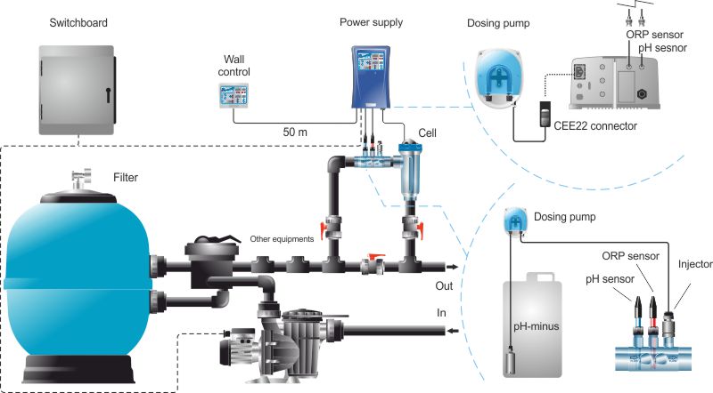 • Chlorine Disinfection: The generated chlorine disinfects the pool water, killing bacteria and algae.